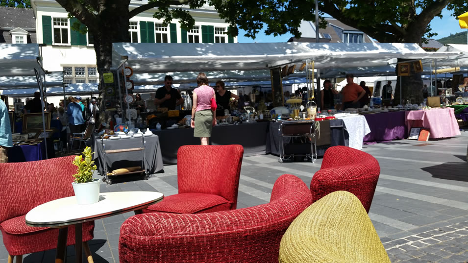 Eingerahmt von einer wundervollen Kulisse, dem Alten Rathaus und der St. Remigius Pfarrkirche, präsentieren zahlreiche Händler rund um den Weinbrunnen auf dem Marktplatz von Königswinter ihre in langen Jahren gesammelten Schätze und Kuriosa. Auf dem direkten Weg vom Fähranleger an der Rheinallee oder dem Sea Life Königswinter zur Drachenfelsbahn erwartet den Besucher ein breites Angebot aus vergangener Zeit. Ob Möbel, Kristall, Silber, Porzellan oder Gemälde – für jeden gibt es etwas zu entdecken.